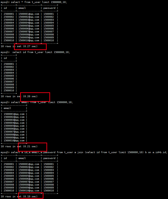 select a.id,a.email,a.password from t_user a join (select id from t_user limit 1500000,10) b on a.id=b.id;