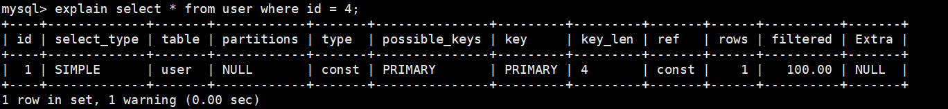 id:select查询的序列号,包含一组数字,表示查询中执行select子句或操作表的顺序- 例子中属于单表搜索,没有联合搜索和多表的查询,因此只有1行