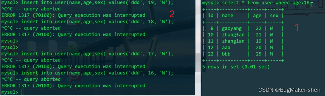 - 因为在这种情况下,插入(age=21,id=5)和(age=21,id=9)是会发生幻读的,所以在一切会影响select * from user where age=18查询结果的地方都加上了间隙锁,但这也会导致一些本不影响查询结果的语句也执行失败,比如插入(age=17,id=10)虽然不影响上述SQL执行结果,由于在间隙锁范围内,依然无法插入